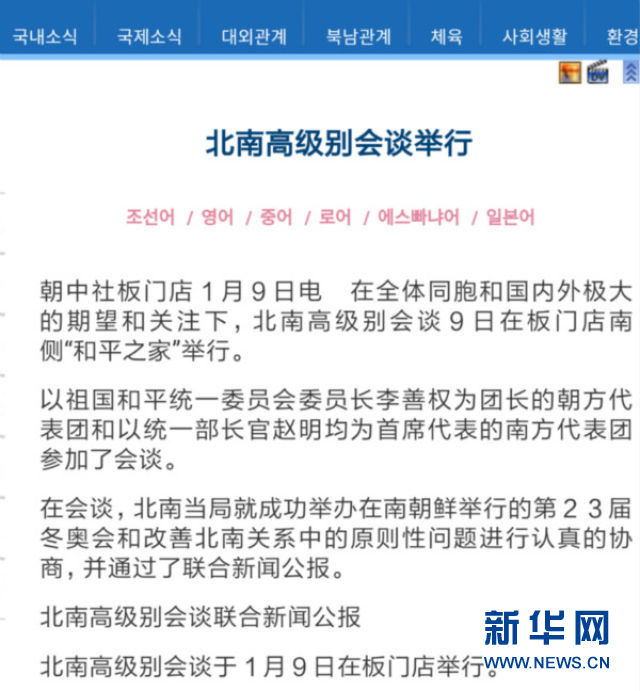 朝鮮中央電視臺(tái)9日沒(méi)有報(bào)道朝韓高級(jí)會(huì)談,在10日下午播報(bào)了朝中社9日晚的報(bào)道。