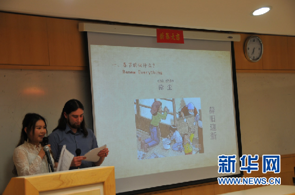 活動(dòng)現(xiàn)場(chǎng),女主持人劉津巧介紹春節(jié)的傳統(tǒng)習(xí)俗。新華網(wǎng)發(fā) 劉學(xué)攝