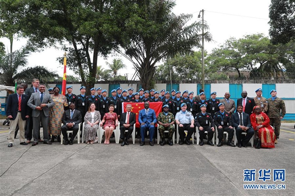 2月5日,利比里亞總統喬治·維阿(前排右七)、聯合國秘書長特別代表法里德·扎里夫(前排右八)在該國首都蒙羅維亞與中國第五支駐利比里亞維和警察防暴隊隊員合影。