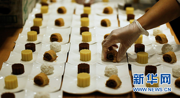 2月8日,在美國洛杉磯,廚師準備傳統中式點心“驢打滾”、“艾窩窩”、“豌豆黃”和“紅豆涼糕”。 新華社記者 李穎 攝