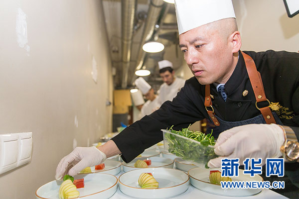 2月19日,在俄羅斯首都莫斯科,中方廚師為菜品擺盤。新華社記者 白雪騏 攝
