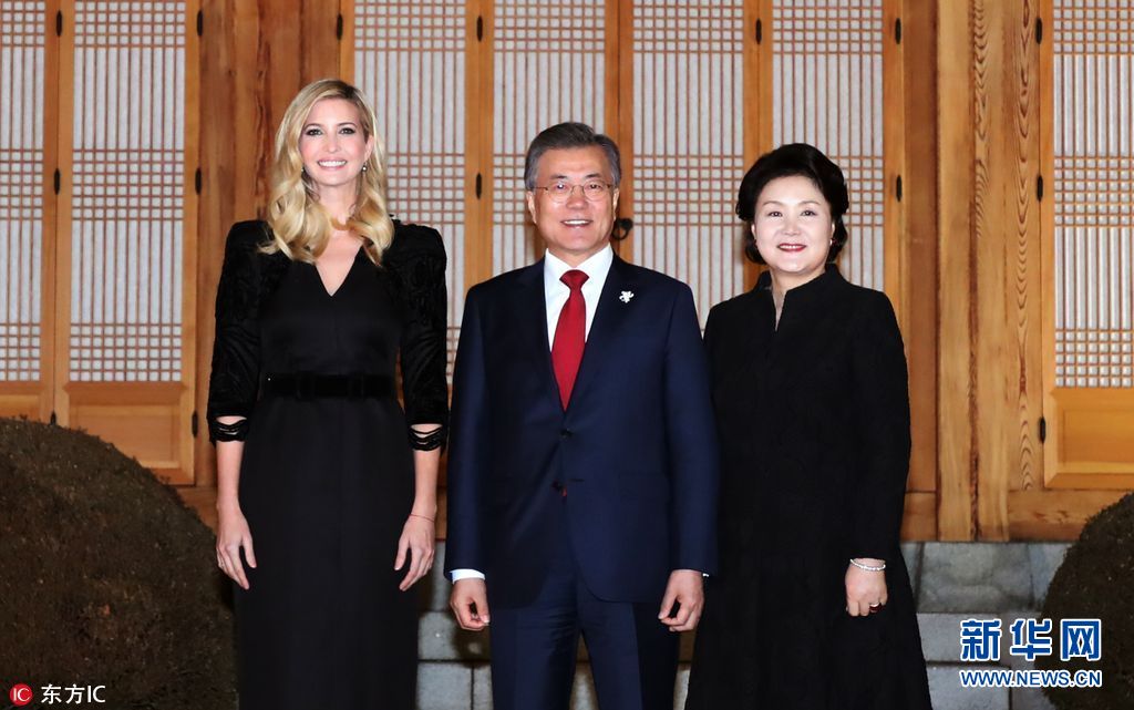 當地時間2018年2月23日,韓國首爾,韓國總統文在寅夫婦在青瓦臺設晚宴,歡迎伊萬卡來訪。美國總統特朗普之女、總統助理伊萬卡率領的美國代表團23日抵韓進行訪問,并將出席平昌冬奧會閉幕式。(圖片來源:東方IC)