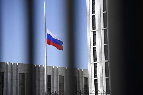 這是3月26日在美國首都華盛頓拍攝的俄羅斯駐美國大使館內的俄羅斯國旗。新華社記者楊承霖攝