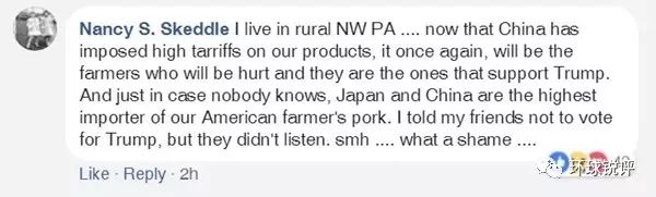 (編者注:我住在賓州西北部農(nóng)村…中國準(zhǔn)備對我們的產(chǎn)品加征關(guān)稅,曾支持特朗普的農(nóng)民會再次受傷……我告訴過我的朋友不要給特朗普投票,但他們不聽。哎,太無語了……)
