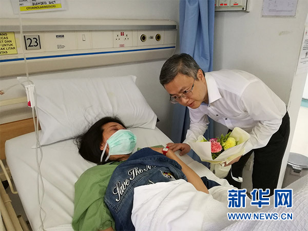 4月7日,在馬來西亞雪蘭莪州,大使館領保官員在醫院探望傷者。新華社發