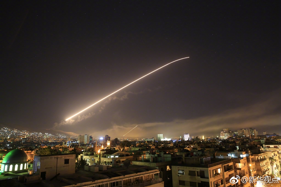 敘利亞國家電視臺14日報道說,當地時間14日凌晨,美國等國對敘首都大馬士革發起軍事行動。報道說,敘利亞軍方防空系統正在對“來自美國、法國和英國的侵略作出回應”,已經攔截了13枚飛行物。當地時間凌晨4時左右,新華社記者在大馬士革市中心附近不時聽到巨大爆炸聲,遠處有從地面飛向天空的紅點,疑似敘防空部隊從市郊卡松山方向進行防空攔截。同時,大馬士革周邊多地升起濃煙。
