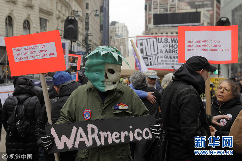 4月15日,美國(guó)紐約,民眾舉行反戰(zhàn)游行,抗議美英法聯(lián)軍襲擊敘利亞。(圖片來(lái)源:視覺(jué)中國(guó))