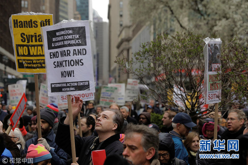 4月15日,美國(guó)紐約,民眾舉行反戰(zhàn)游行,抗議美英法聯(lián)軍襲擊敘利亞。(圖片來(lái)源:視覺(jué)中國(guó))