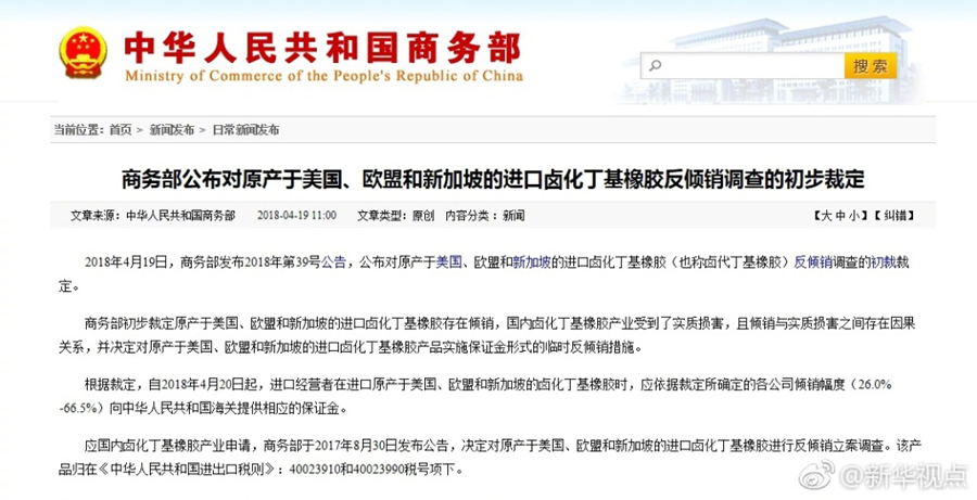 新華網北京4月19日電 商務部今天發布公告,初步裁定原產于美國、歐盟和新加坡的進口鹵化丁基橡膠存在傾銷。根據裁定,自2018年4月20日起,進口經營者在進口原產于美國、歐盟和新加坡的鹵化丁基橡膠時,應依據裁定所確定的各公司傾銷幅度(26.0%-66.5%)向中華人民共和國海關提供相應的保證金。?(據新華社“新華視點”微博報道)