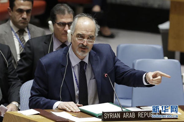 資料圖:2月24日,在位于紐約的聯合國總部,敘利亞常駐聯合國代表賈法里(前)在安理會通過敘利亞全境停火決議草案后發言。新華網記者 李木子 攝