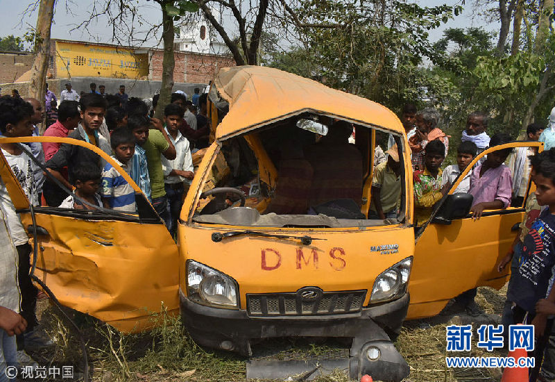 當地時間2018年4月26日,一輛載有22名兒童的校車在印度北方邦庫新加同一輛火車相撞,事故造成13名兒童死亡,8人傷勢嚴重。(圖片來源:視覺中國)