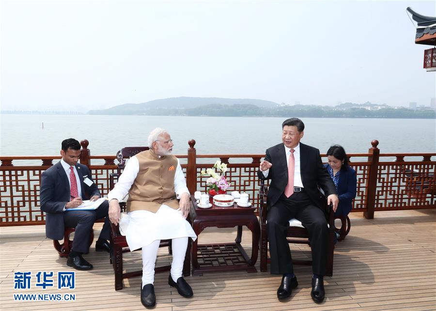 4月27日和28日,國家主席習近平在武漢東湖賓館同印度總理莫迪舉行非正式會晤。這是4月28日,習近平同莫迪交談。 新華社記者 龐興雷攝