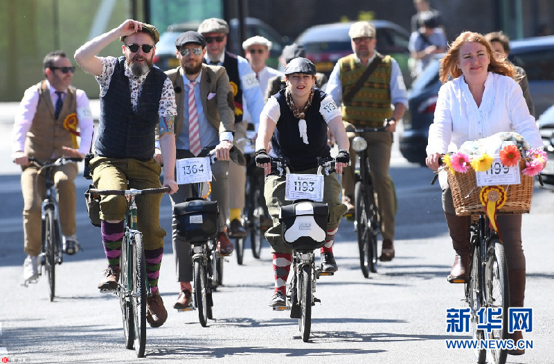 當地時間2018年5月5日,英國倫敦,當地舉辦復古騎行活動,民眾身穿花呢子服裝騎車穿行在倫敦街頭。今年是該活動舉辦十周年。(圖片來源:東方IC)