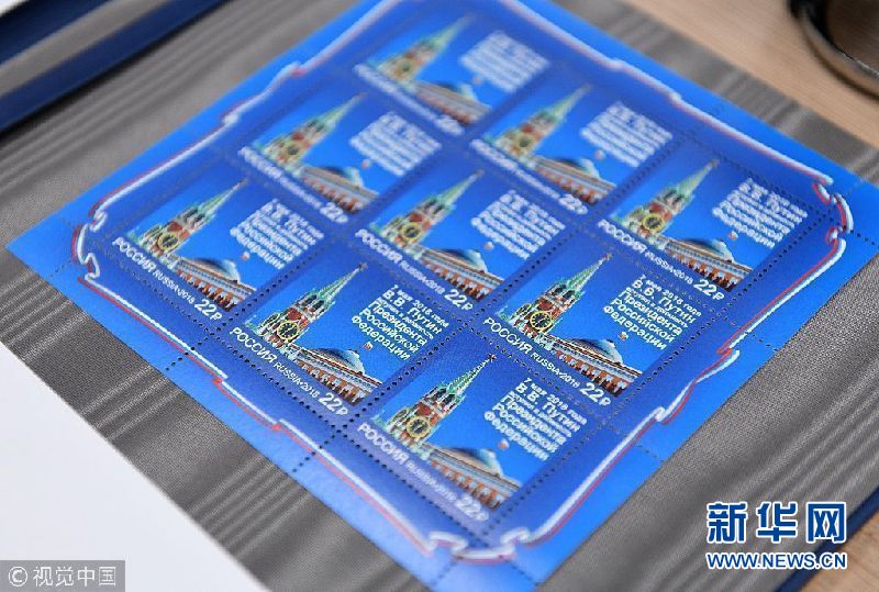 當地時間2018年5月7日,俄羅斯莫斯科,俄羅斯發行普京就職紀念郵票。(圖片來源:視覺中國)