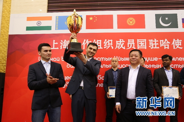 ? 中國駐哈薩克斯坦大使張漢暉(前排右一)為冠軍獲得者塔吉克斯坦隊頒發獎杯。 新華網發 阿比洛夫攝
