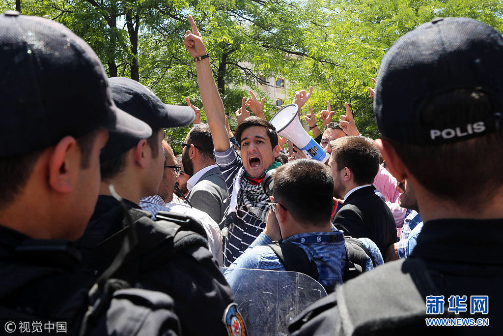 5月15日,土耳其安卡拉,示威者在以色列領事館附近投擲雞蛋和石塊,抗議美國駐以色列使館遷至耶路撒冷。(圖片來源:視覺中國)