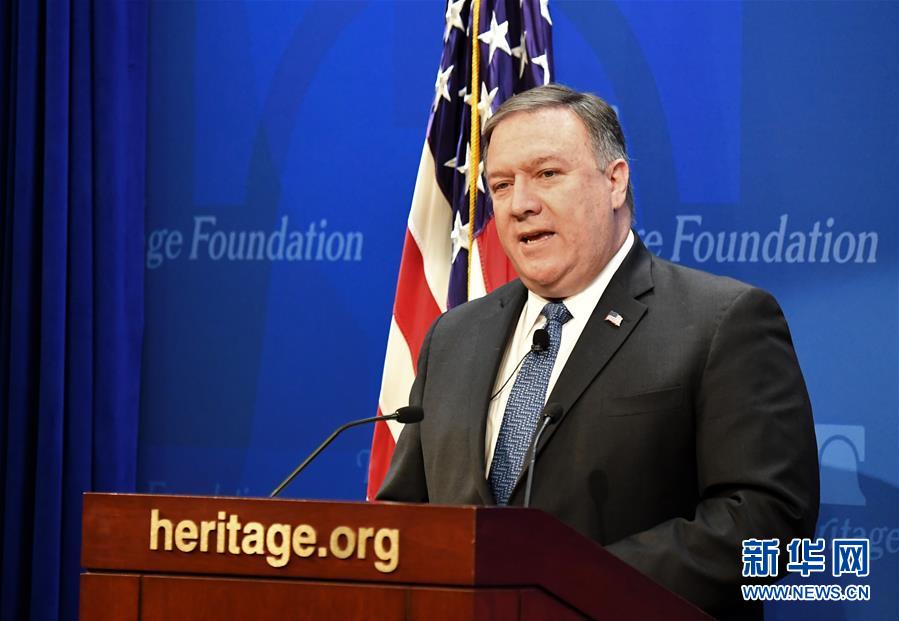 5月21日,美國國務卿蓬佩奧在華盛頓的美國智庫傳統基金會發表演講。美國國務卿蓬佩奧當日表示,伊朗如果不改變當前路線,將受到美國“最嚴厲的制裁”。 新華社記者楊承霖攝
