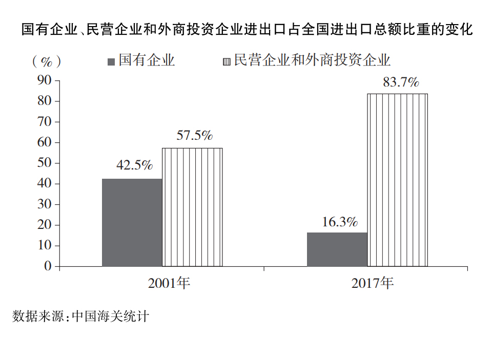 全面放開外貿(mào)經(jīng)營權(quán)。促進經(jīng)營主體多元化,激發(fā)各類企業(yè)開展貿(mào)易的積極性。自2004年7月起,中國對企業(yè)的外貿(mào)經(jīng)營權(quán)由審批制改為備案登記制,極大地釋放了民營企業(yè)的外貿(mào)活力,民營企業(yè)進出口發(fā)展迅速,份額持續(xù)擴大,成為對外貿(mào)易的重要經(jīng)營主體。民營企業(yè)和外商投資企業(yè)進出口占全國進出口總額的比重由2001年的57.5%上升到2017年的83.7%。2017年,作為第一大出口經(jīng)營主體的民營企業(yè)出口占比達46.6%。