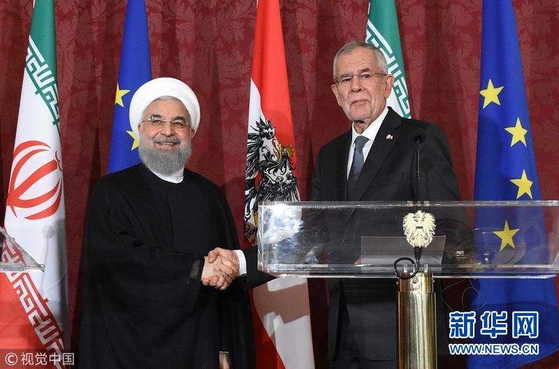 2018年7月4日,奧地利維也納,伊朗總統(tǒng)魯哈尼抵達(dá)奧地利進(jìn)行訪問,會晤?yuàn)W地利總統(tǒng)范德貝倫。伊朗總統(tǒng)魯哈尼2日出發(fā)前往瑞士和奧地利訪問。他這次西歐行將重點(diǎn)討論伊朗核問題全面協(xié)議。(圖片來源:視覺中國)