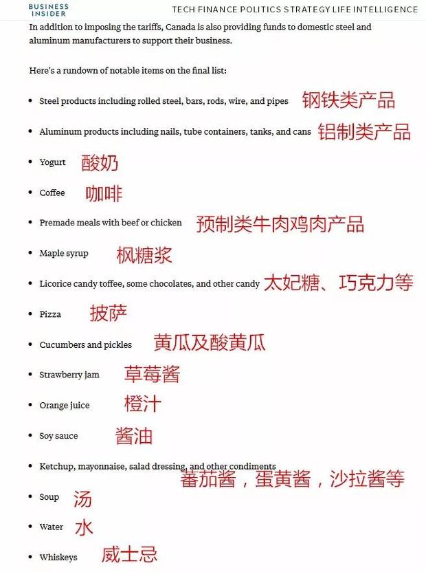 美國網(wǎng)站Business Insider貼心做了個(gè)大致梳理,不難看出,這份后續(xù)打擊清單,正如加拿大廣播公司評(píng)論所說,乍看上去簡(jiǎn)直像是家庭主婦去超市的購物單:從比薩餅到草莓醬,從威士忌到酸黃瓜,跟第一輪打擊的鋼鋁顯得實(shí)在不匹配。