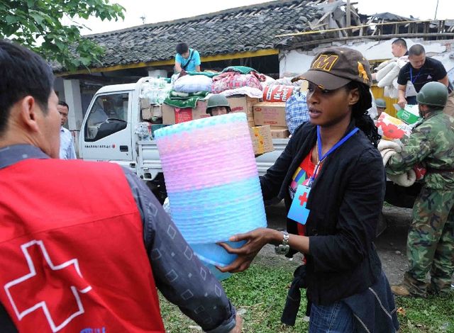 2008年5月17日,在“5·12”汶川特大地震重災區四川省什邡市湔氐鎮白虎頭村,來自非洲的志愿者瑪利亞在搬運救援物資。 新華社記者劉海峰攝