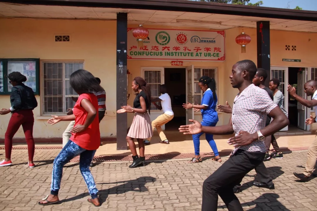 來到盧旺達大學孔子學院,正趕上老師們帶領參加暑期班的同學們在操場上打太極拳。一招一式,頗有章法。