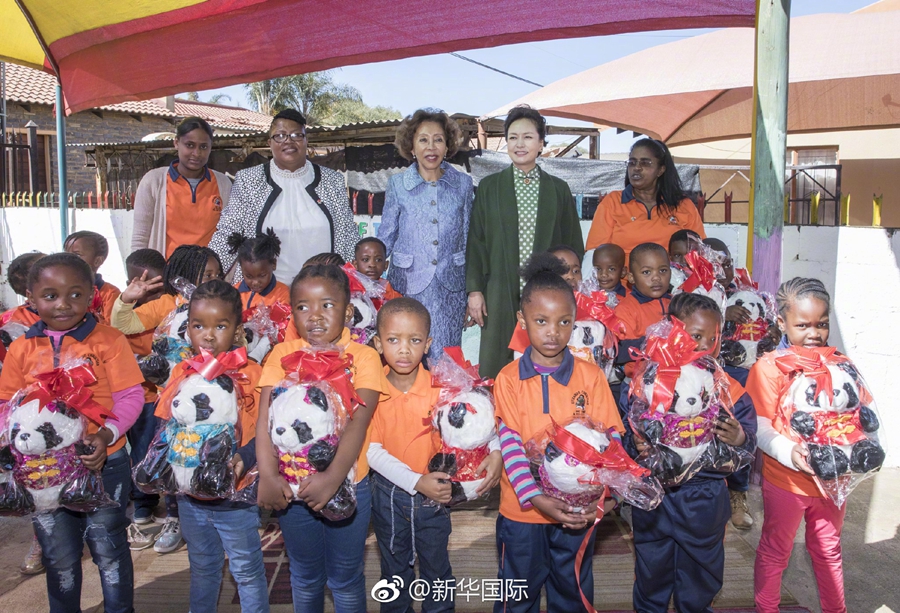 彭麗媛和莫采佩抵達時,非洲自助基金會負責人、托兒所園長等在門口迎接。40名活潑可愛的南非兒童揮舞中南兩國國旗列隊歡迎,彭麗媛俯身同孩子們親切握手問候。彭麗媛來到庭院,20多名兒童手持兩國國旗,輪流用中英文高聲呼喊“歡迎歡迎”。孩子們伴著俏皮輕快的舞蹈動作,合唱英文歌曲《歡迎您》、用中文吟唱中國古詩兒歌《詠鵝》、演唱南非說唱歌曲。彭麗媛認真聆聽,頻頻點頭微笑、不時鼓掌稱贊,夸獎孩子們中文發音準確。彭麗媛來到教室,觀看兒童繪畫、識字,和孩子們用當地傳統手語互致問候。彭麗媛向孩子們贈送玩具、文具、圖書,并在孩子們自己創作的手印畫上題寫“前程似錦”,勉勵孩子們好好學習、茁壯成長。彭麗媛表示,兒童成長關乎一個國家未來。兒童早期教育,最重要的是樹德育人,引導他們樹立遠大志向、培育美好心靈。希望中南友好事業從娃娃抓起,讓他們長大后做兩國友好事業的傳承者和接班人。