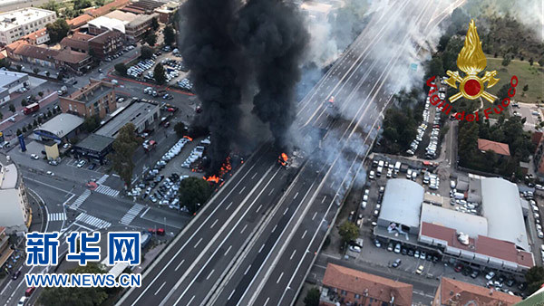 這張8月6日意大利消防部門發布在社交媒體推特上的照片顯示的是博洛尼亞油罐車爆炸事件現場。 新華社發
