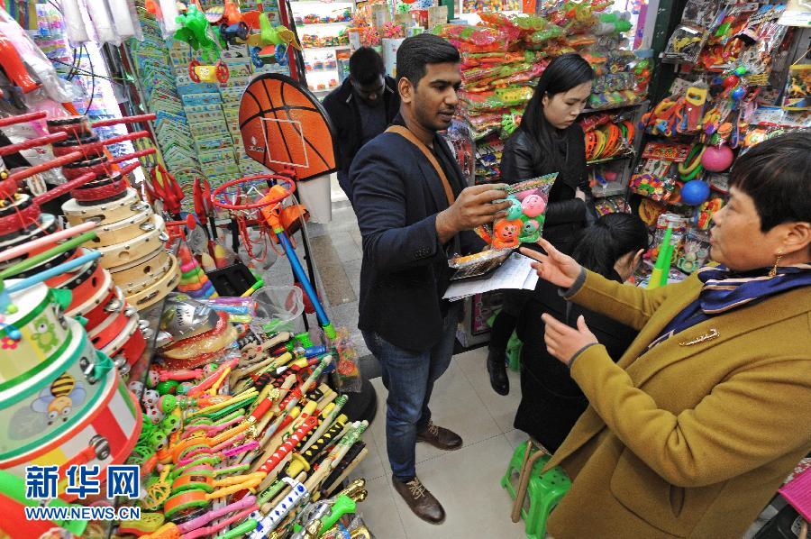 浙江義烏國際商貿城小商品經營戶(右一)和一名非洲客商談生意(2017年1月5日攝)。 新華社記者 譚進 攝