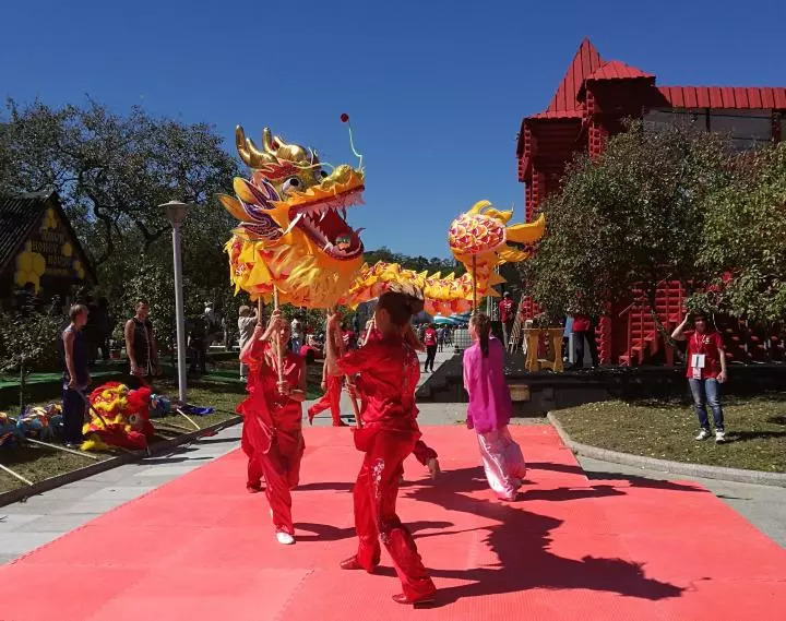 遠東風采街上表演舞龍的俄羅斯年輕人(新華社記者蔣國鵬攝)