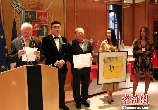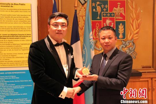 9月21日晚,中國工筆畫家崔景哲(左)在巴黎榮獲全球公益聯盟文學(藝術)金質勛章,也是此次頒獎典禮所有獲獎者中唯一一位中國人。江蘇凱旋體育文化董事長吳愛華等知名人士對崔景哲的獲獎表示祝賀。李洋 攝
