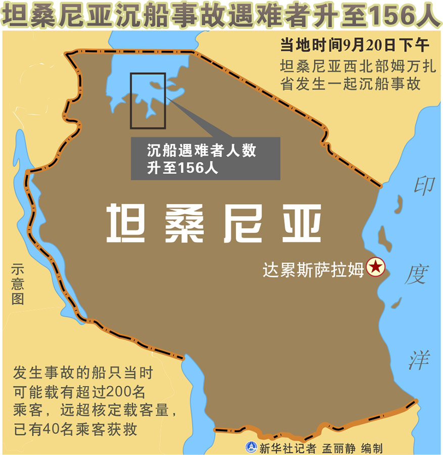 新華社達累斯薩拉姆9月22日電(記者李斯博 高竹)坦桑尼亞官員22日說,該國西北部姆萬扎省20日發(fā)生的沉船事故已造成至少156人死亡。