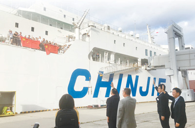 9月10日,中國駐大阪總領館工作人員把因臺風滯留日本關西國際機場的部分中國旅客送上助其返鄉的“新鑒真”號。資料圖片