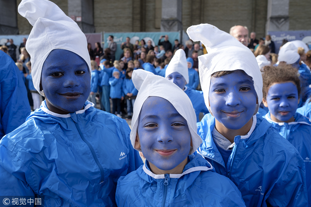 當地時間2018年10月23日,比利時布魯塞爾,民眾參加動畫形象“藍精靈”60歲慶?;顒印#▓D片來源:視覺中國)