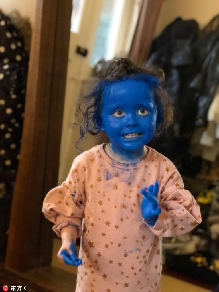 2018年4月17日報道,國外3歲的小女孩Eve把自己涂抹成了“藍精靈”?。▓D片來源:東方IC)