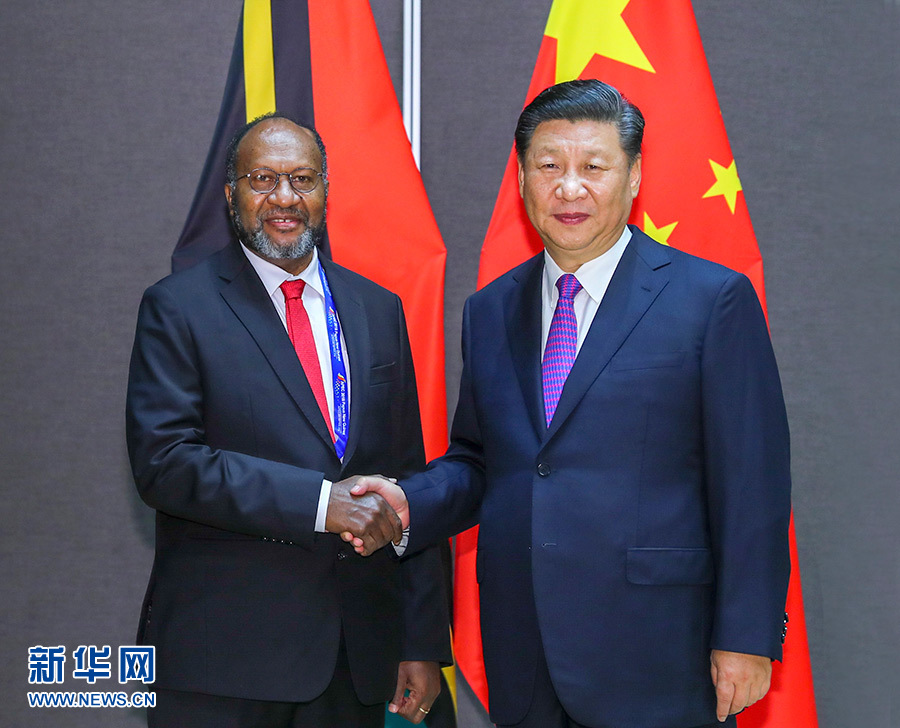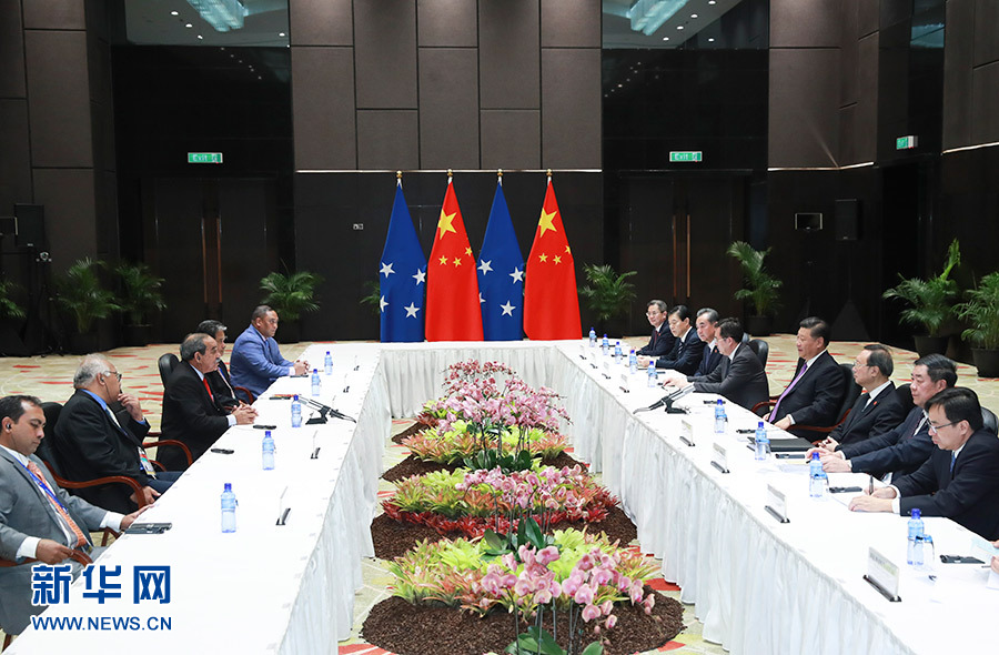 11月16日,國家主席習近平在莫爾茲比港分別會見建交太平洋島國領導人。這是習近平會見密克羅尼西亞聯邦總統克里斯琴。 新華社記者 龐興雷 攝