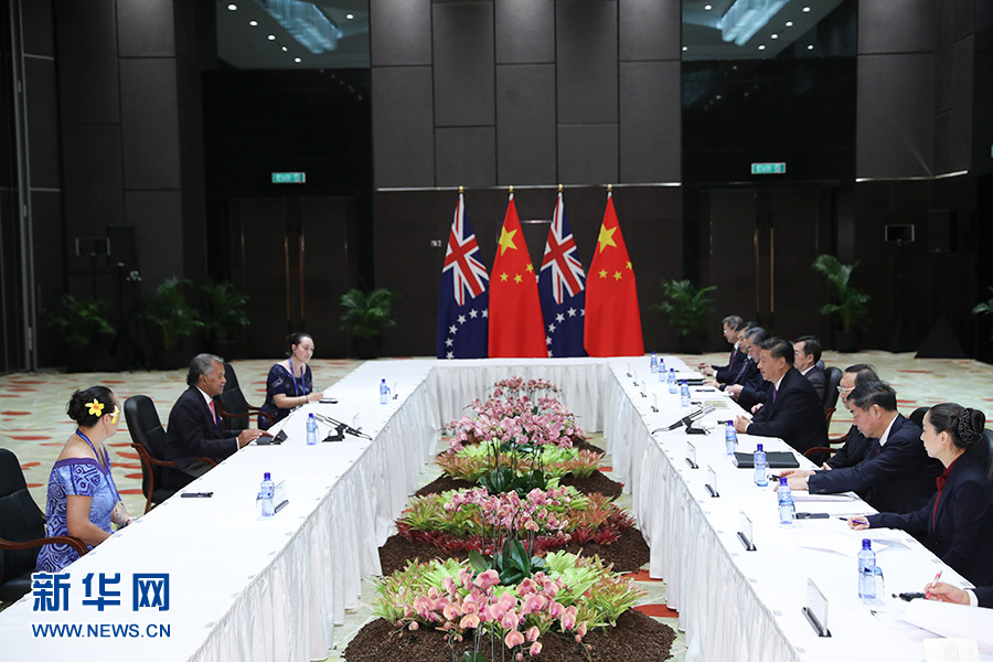 11月16日,國家主席習近平在莫爾茲比港分別會見建交太平洋島國領導人。這是習近平會見薩摩亞總理圖伊拉埃帕。 新華社記者 謝環馳 攝