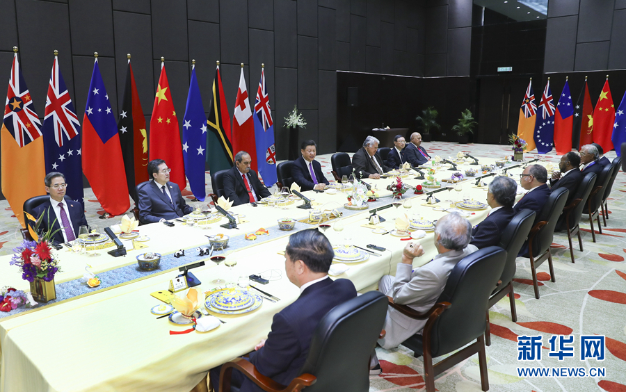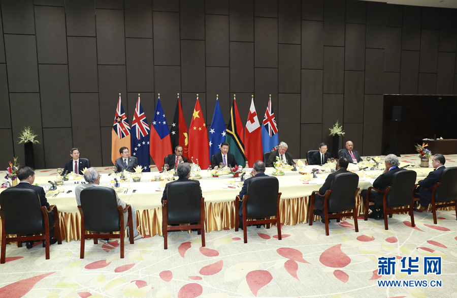 11月16日,國家主席習近平在莫爾茲比港同巴布亞新幾內亞總理奧尼爾、密克羅尼西亞聯邦總統克里斯琴、薩摩亞總理圖伊拉埃帕、瓦努阿圖總理薩爾瓦伊、庫克群島總理普納、湯加首相波希瓦、紐埃總理塔拉吉等建交太平洋島國領導人以及斐濟政府代表、國防部長昆布安博拉舉行集體會晤。習近平主持會晤并發表主旨講話。 新華社記者 謝環馳 攝