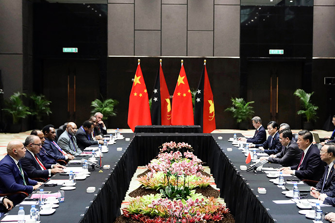 11月16日,國家主席習近平在莫爾茲比港同巴布亞新幾內亞總理奧尼爾、密克羅尼西亞聯邦總統克里斯琴、薩摩亞總理圖伊拉埃帕、瓦努阿圖總理薩爾瓦伊、庫克群島總理普納、湯加首相波希瓦、紐??偫硭冉ń惶窖髰u國領導人以及斐濟政府代表、國防部長昆布安博拉舉行集體會晤。習近平主持會晤并發表主旨講話。新華社記者 謝環馳 攝