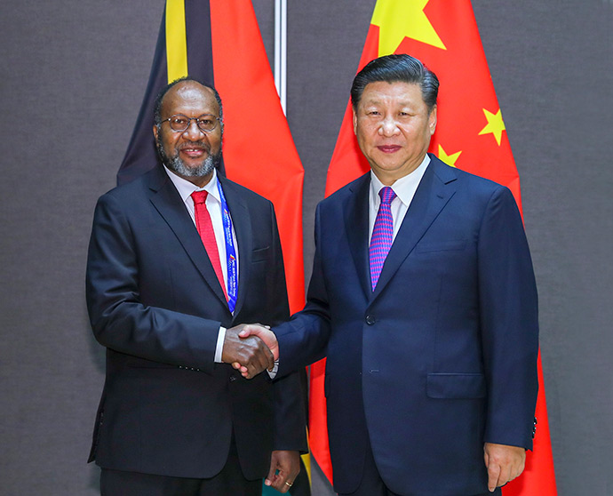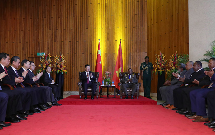 11月16日,國家主席習近平在莫爾茲比港分別會見建交太平洋島國領導人。這是習近平會見紐??偫硭?。新華社記者 丁林 攝