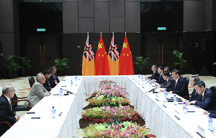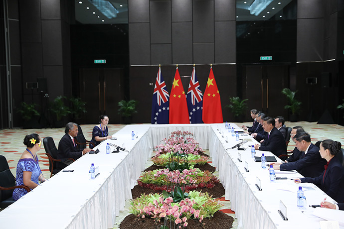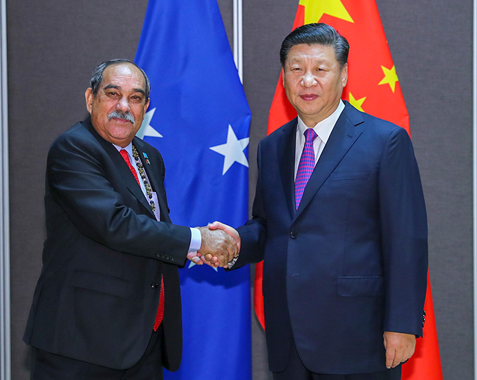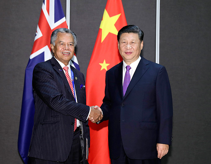 11月16日,國家主席習近平在莫爾茲比港分別會見建交太平洋島國領導人。這是習近平會見庫克群島總理普納。新華社記者 丁林 攝