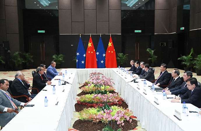 11月16日,國家主席習近平在莫爾茲比港分別會見建交太平洋島國領導人。這是習近平會見密克羅尼西亞聯邦總統克里斯琴。新華社記者 龐興雷 攝