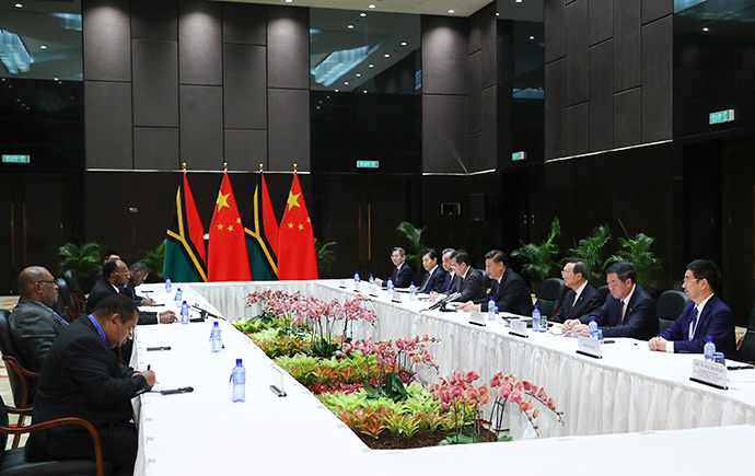 11月16日,國家主席習近平在莫爾茲比港分別會見建交太平洋島國領導人。這是習近平會見瓦努阿圖總理薩爾瓦伊。新華社記者 謝環馳 攝