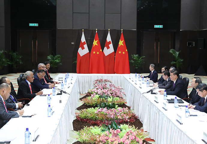 11月16日,國家主席習近平在莫爾茲比港分別會見建交太平洋島國領導人。這是習近平會見湯加首相波希瓦。新華社記者 丁林 攝