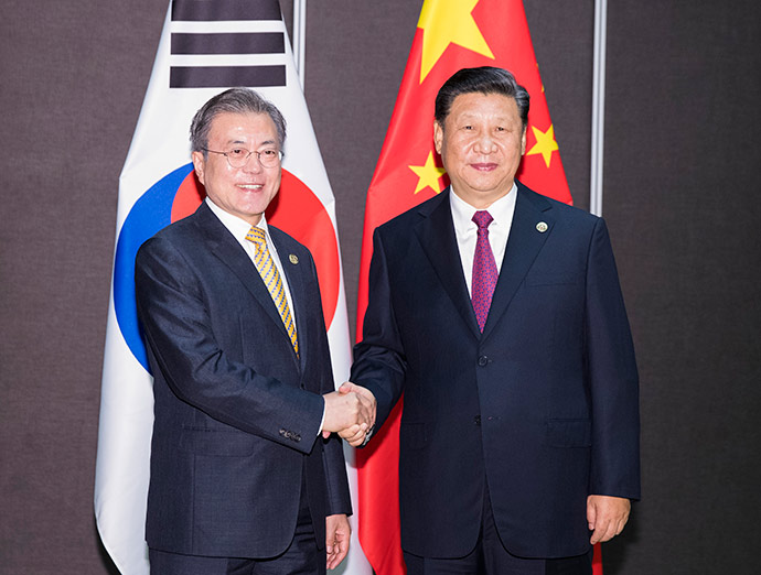 11月17日,國(guó)家主席習(xí)近平在莫爾茲比港會(huì)見韓國(guó)總統(tǒng)文在寅。新華社記者 龐興雷 攝