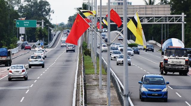 文萊首都斯里巴加灣市道路兩側掛起中文兩國國旗。新華社記者王申攝