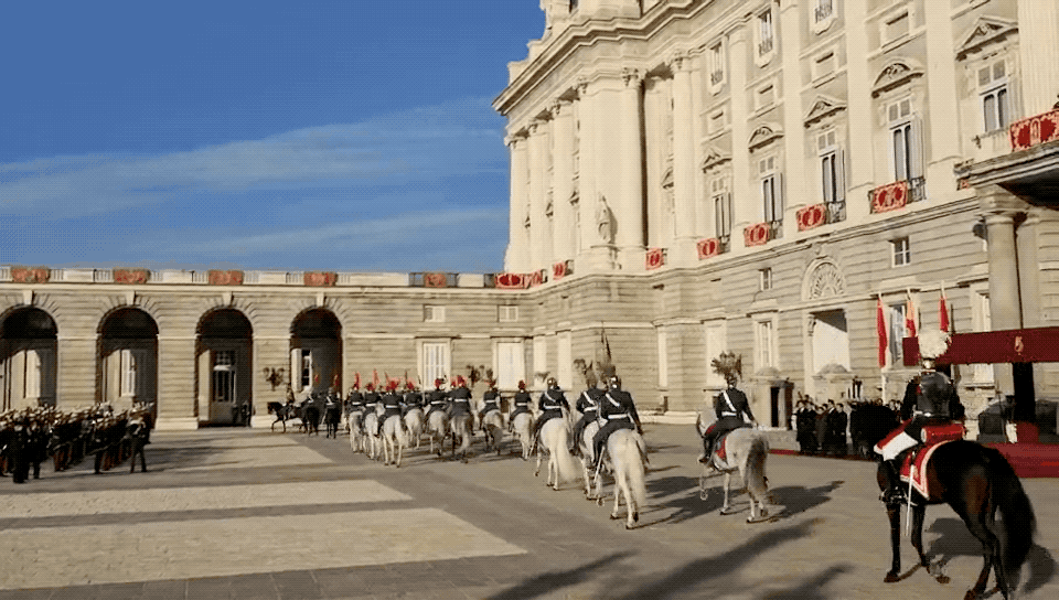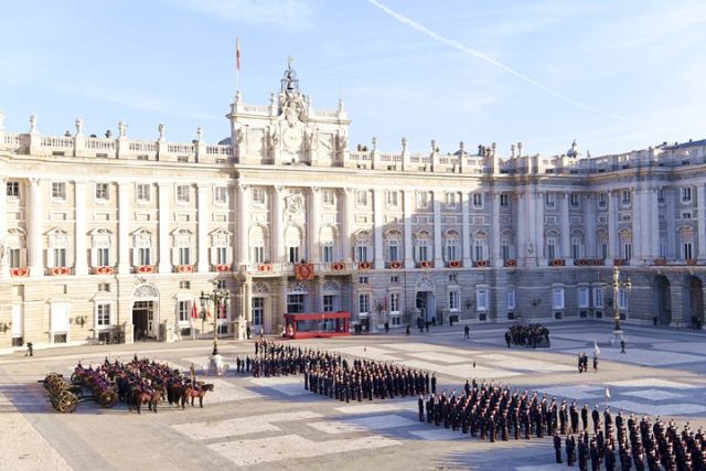 三場宴會之外,令人印象深刻的便是戰(zhàn)機護航和在馬德里王宮武器廣場舉行的盛大歡迎儀式。
