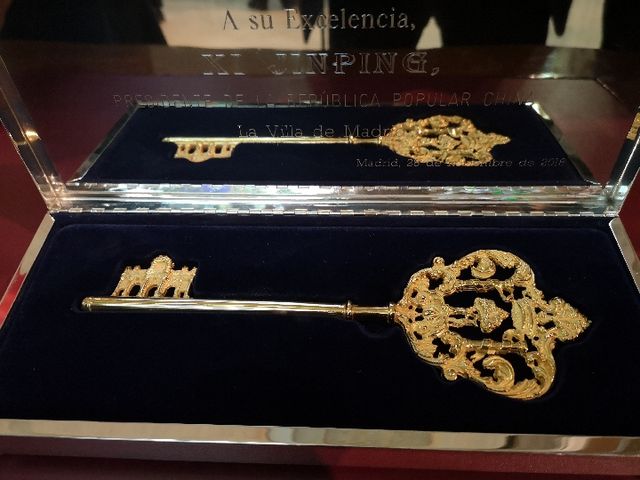 沒錯,這就是馬德里城市金鑰匙。鑰匙尾部是馬德里市徽上的“樹莓和熊”,齒部是馬德里地標建筑阿爾卡拉門。11月28日,馬德里市長卡梅納代表馬德里全體市民把它贈送給習主席,表達對遠道而來的中國貴賓的尊重和敬意。
