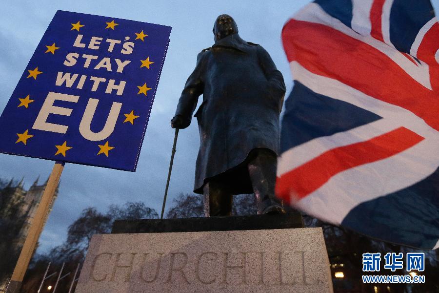1月15日,在英國倫敦,民眾在議會大廈外的英國前首相丘吉爾雕像前參加集會。 英國議會下院15日投票否決了此前英國政府與歐盟達成的“脫歐”協議。在經過5天辯論后,英國議會下院15日以432票反對、202票支持的投票結果否決了“脫歐”協議。 新華社發(蒂姆·愛爾蘭攝)