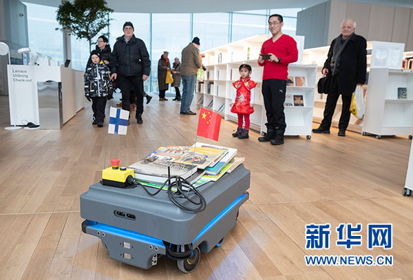 2月4日,機器人載著捐贈的英文圖書在芬蘭赫爾辛基奧迪圖書館內巡游展示,引得許多讀者駐足觀看。新華社發(馬蒂·馬蒂凱寧 攝)